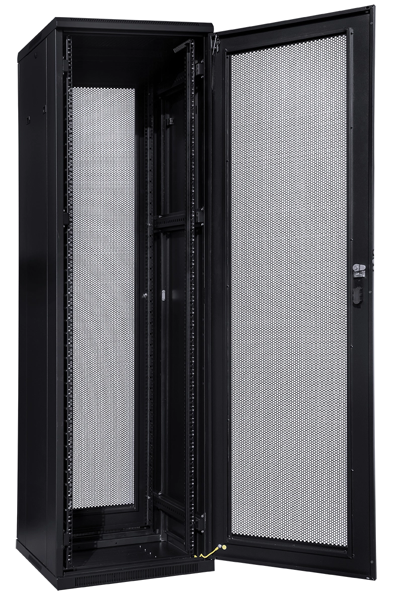 Szklane drzwi przednie o grubości 5 mm, odwracane o kącie otwarcia 120 stopni, dodają elegancji i umożliwiają łatwy dostęp do urządzeń. Z kolei tylne pełne drzwi zapewniają kompleksową ochronę zgodnie z normą IP20. Duże przepusty kablowe na górze i na dole szafy ułatwiają sprzątanie przewodów i utrzymanie porządku w przestrzeni serwerowej.